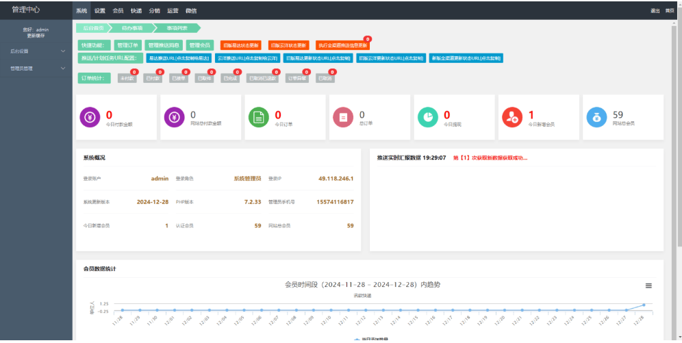 快递小程序,主要就是帮别人发快递,在原本的用户与快递之间,增加中间代理,用户在小程序下单,我们把用户需要发的快递聚集到一起,团购更优惠的价格,赚取其中一个差价!当订单量较大的时候,就有与各快递平台合作的价值,能拿到更优惠的价格!小程序还包含了完善的广告管理、会员和分销功能!支持官易达/云洋第三方平台接口接口!搭建说明:php7.2 mysql5.6·上传源码到网站根目录解压数据库连接修改:/application/database.php运行目录/,关闭防跨站,伪静态thinkphp导入数据库文件申请ssl,强制https后台/admin admin 123456设置->基础设置->站点设置:修改站点网站域名设置->小程序配置->小程序参数配置:修改小程序的信息小程序打包:·/manifest.json中重新获取appid,源码视图中修改小程序appid·/api.js中修改域名地址·/pages.json 285行修改appid需要正式微信小程序账号,在微信公众平台小程序后台中添加对应的插件(物流服务查询组件);否则进不去前台!物流插件安装